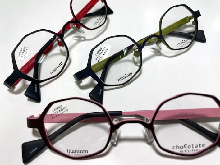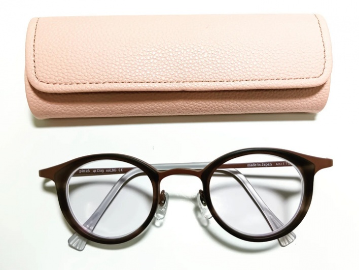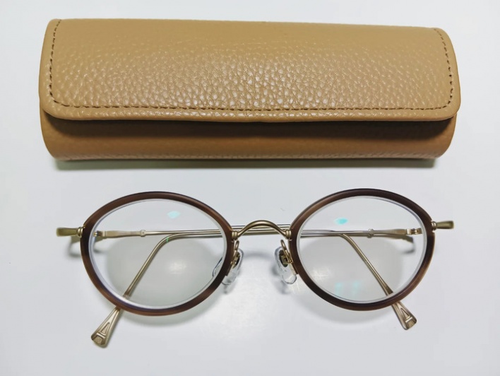 レンズ面積が大きいと耳側のレンズの厚みが厚く重くなてしまうので、小型のフレームを選択。