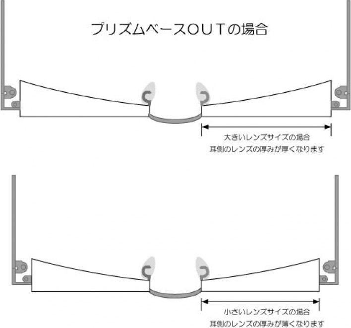 度なしプリズムの為、鼻側のレンズの厚みが厚くなっています。