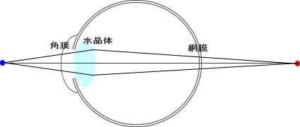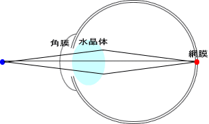 近くを見たときは光が1点から広がって光が眼を通過する為、何もしてない状態だと焦点(ピント)が網膜の後ろで結んでしまい見ることができません。 |