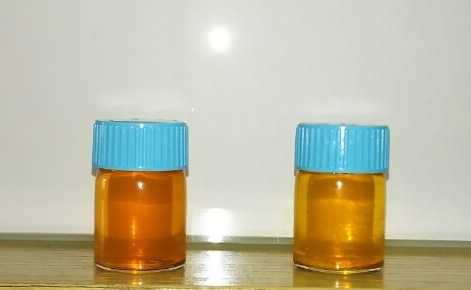 まず、ルテインのサプリメントを溶かして液体にし、全く同じ濃度のものを天気のいい日にそれぞれ「ルテイン保護レンズ」と「UVカットレンズ」をかぶせて下の写真のように太陽の光に当てました。@