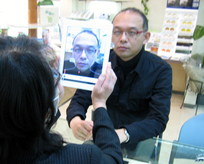 特に度の強い方は、フレームを選ぶ時、メガネをはずして、鏡を見てもフレームの感じが判りにくく苦労します。そんな方でも楽しくフレーム選びが出来る優れもの!それが、フレームセレクターです。